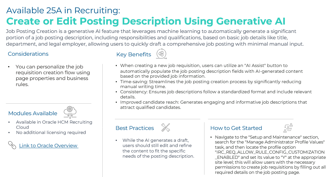 Job Posting Creation is a generative AI feature that leverages machine learning to automatically generate a significant portion of a job posting description, including responsibilities and qualifications, based on basic job details like title, department, and legal employer, allowing users to quickly draft a comprehensive job posting with minimal manual input